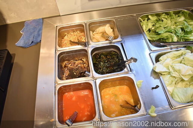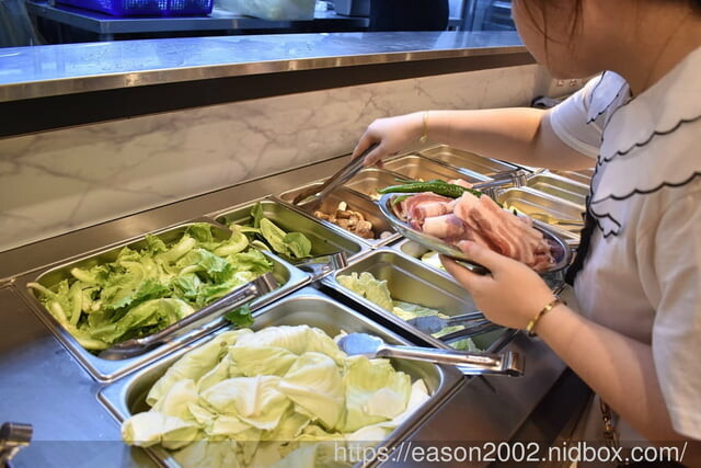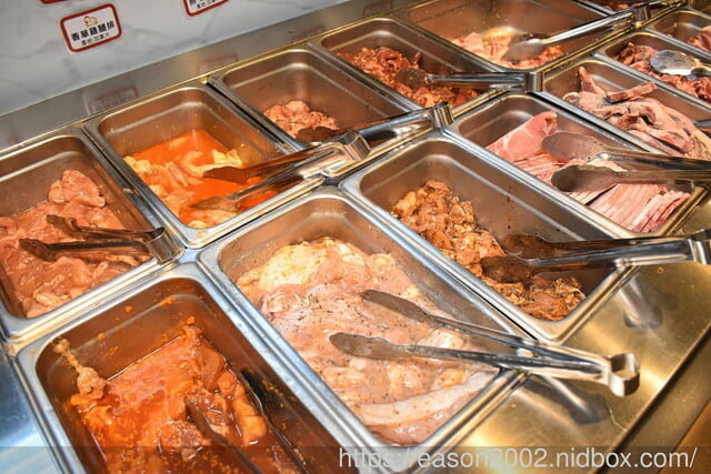 提供的新鮮食材多達50種以上,半開放式廚房,用餐時段,服務人員忙碌補料,擔心檯面食材不夠你夾,肉類品項最少10樣以上,雞、豬、牛、羊 通通都有,還有生猛海鮮、蔬菜、烤物、火鍋料等。