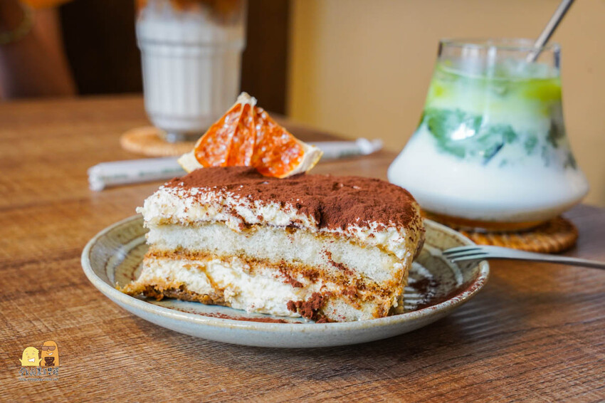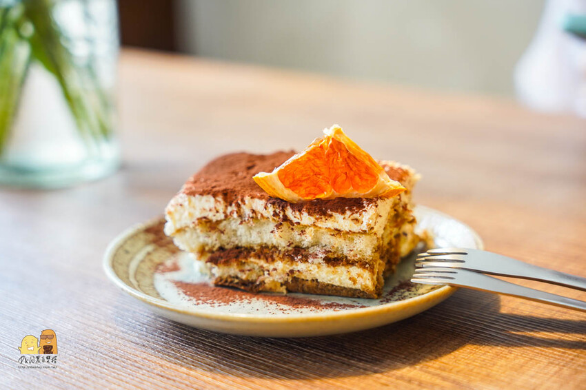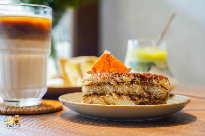 桃園八德三宅咖啡的提拉米蘇中間是慕斯搭配蛋糕體,上面撒上可可粉一層又一層疊起來