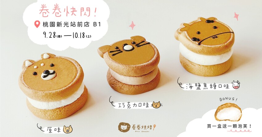 台中伴手禮名店卷卷烘焙來到桃園新光站前店B1快閃啦!超級無敵可愛療癒的生乳銅鑼燒,還有推出快閃獨家限定9入獨立包裝禮盒,有柴柴、傲嬌貓和哞哞三種圖案,口味分別是原味、巧克力和初登場的海鹽焦糖,每顆獨立包裝,提前預訂再送一顆北海道生乳泡芙和卷卷可愛紙袋,快閃時間是9/28(四)到10/18(三)喔!