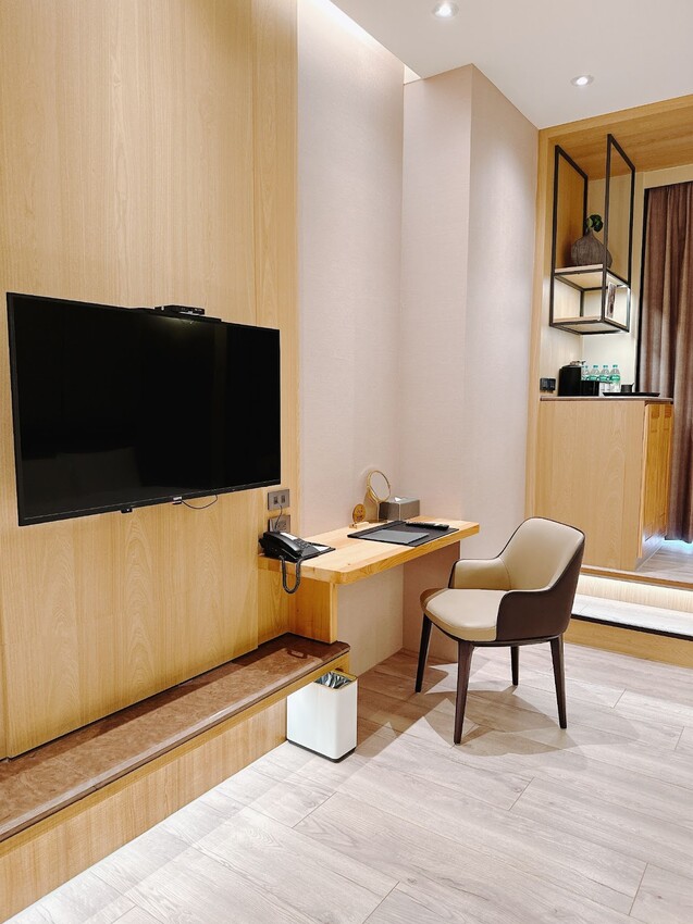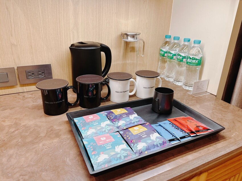 精緻的茶水吧檯放置有Drink 電子煮水器、飲用水、咖啡和茶包~