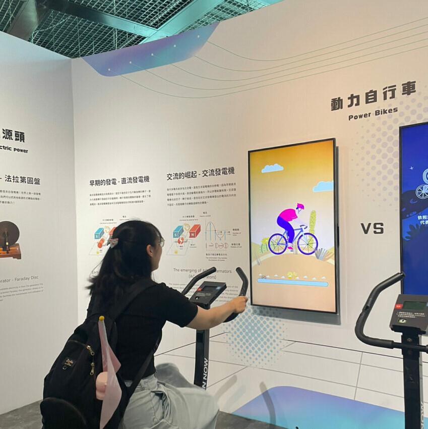 認識完電的原理,也可以體驗互動小遊戲!有跳舞機、釣魚機、動力自行車等等,用自己的力量發電,這區也很適合親子一起同樂唷。