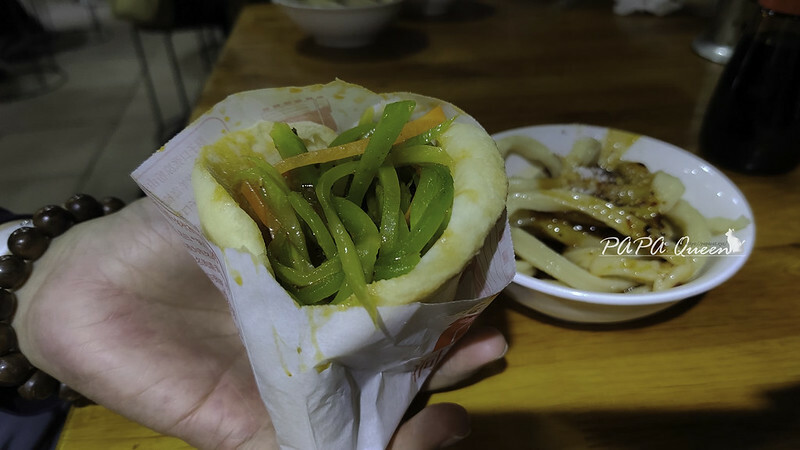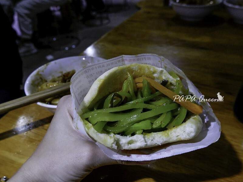 鍋盔三絲:菜心絲,紅蘿蔔,海帶絲,這裡的鍋盔接近台中那個羊角饅頭,十足麵香表面是炕出來的餅味,三絲爽脆一咬我笑說這個很適合搭”白粥”,重口味吃到最底部就發現給的辣油滿滿啊,辣度指數2.5星!