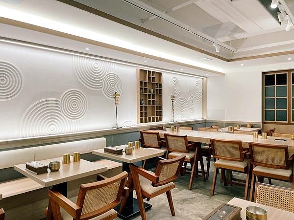 店裡分為前後兩個區塊,店裡以白色跟淺木色為主,風格中西交融,不帶韓式元素,反而有一些中國風.隔屏花磚玻璃超級加分.後面的區塊進廚房,比較熱也稍微有些油煙
