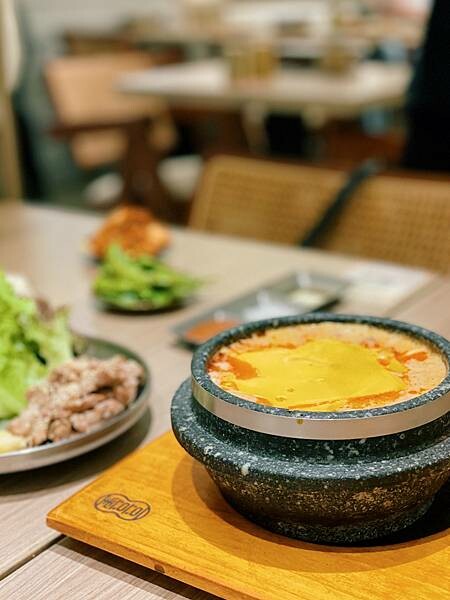 牛肉豆腐鍋個人套餐NT680 (內含生菜包肉,豆腐鍋,飯,紅/綠茶一杯)其實豆豆里的豆腐鍋有超多選擇,豆乳,南瓜,咖哩…等等.第一次來的我們還是決定選擇最基本款的牛肉豆腐鍋試試.上桌時有發現鍋子比一般小一些,不過蓄熱能力很好,吃到最後湯都還是熱的.和濟州豆腐鍋不同他們是使用韓劇裡那種涓豆腐.細緻滑嫩如同豆花.我們選擇在鍋上加了一片起司,湯底變得更加濃郁,很特別的是豆腐鍋內的蛋,一直呈現在糖心和全熟之間.湯底的味道也有別於其他店家的口味,微微的辣感但入喉後卻很溫醇.