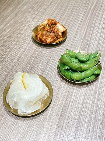 入座後服務生會先上三碟小菜,柚香大根,泡菜和毛豆.三個都可以無限續
