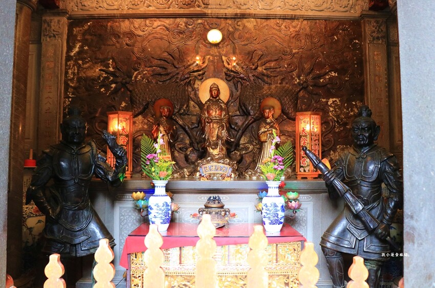 前殿正門並列哼哈二將,兩邊為四大金剛,石柱無論圓雕,浮雕,透雕,皆精緻生動,無不巧妙,栩栩如生