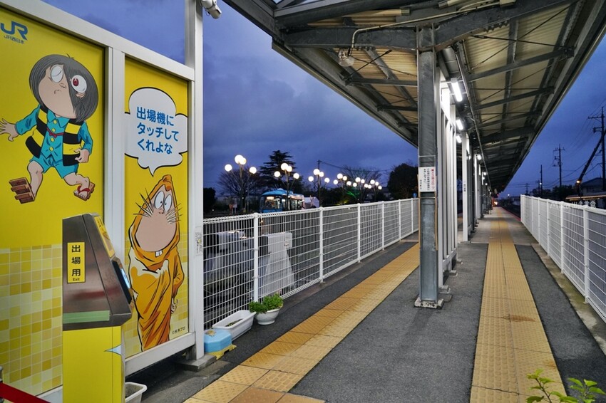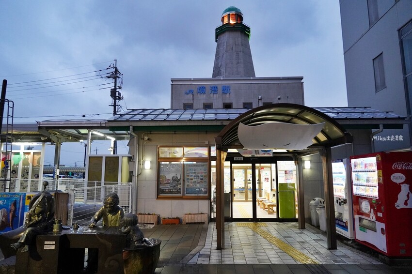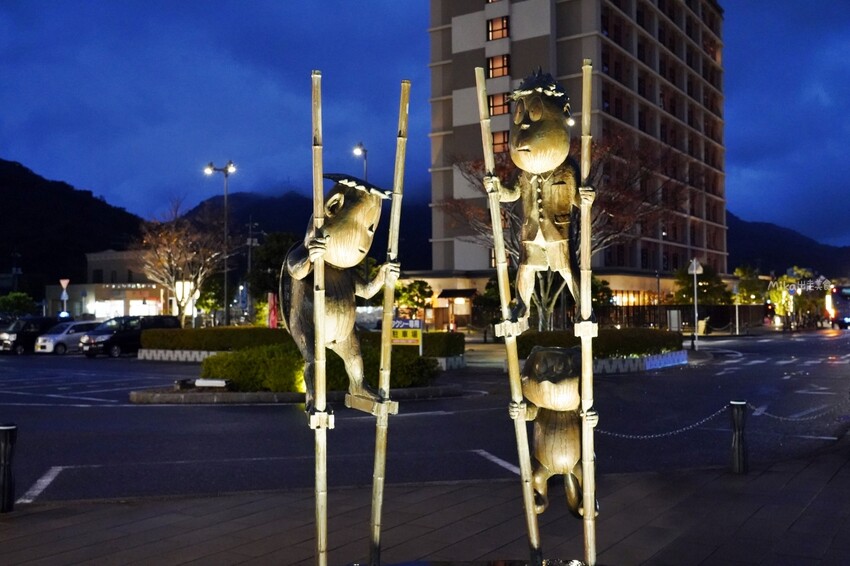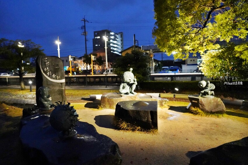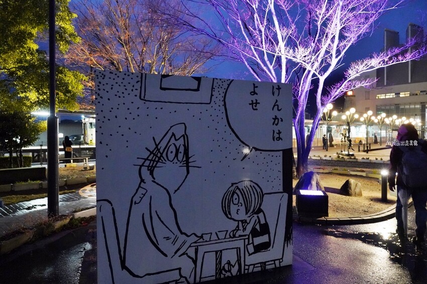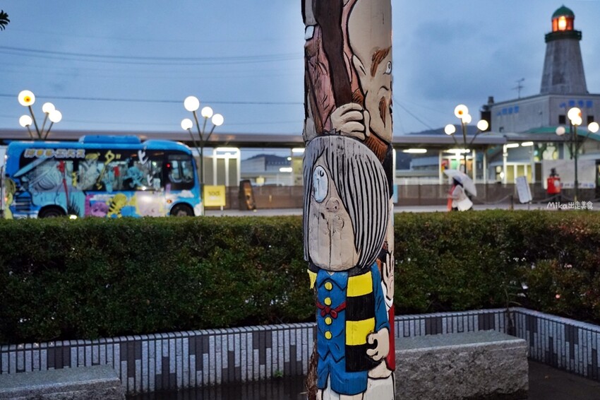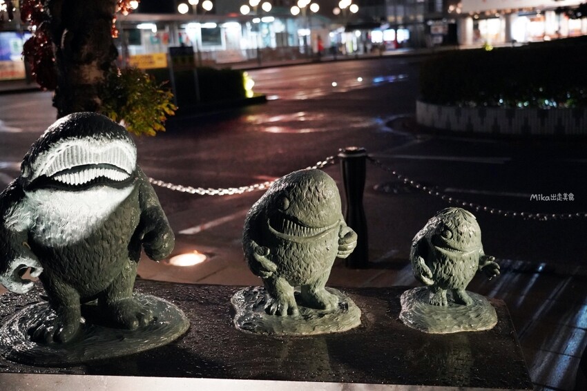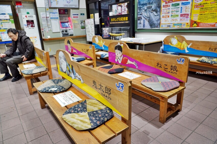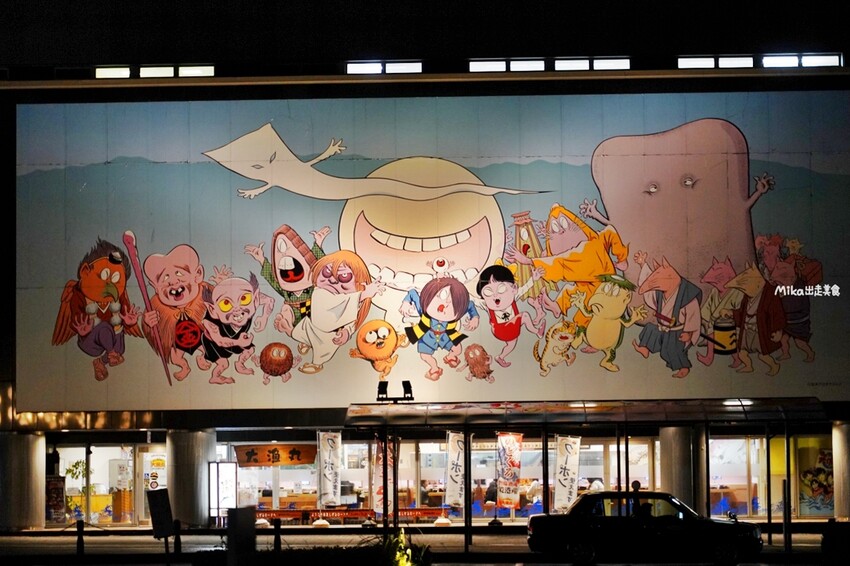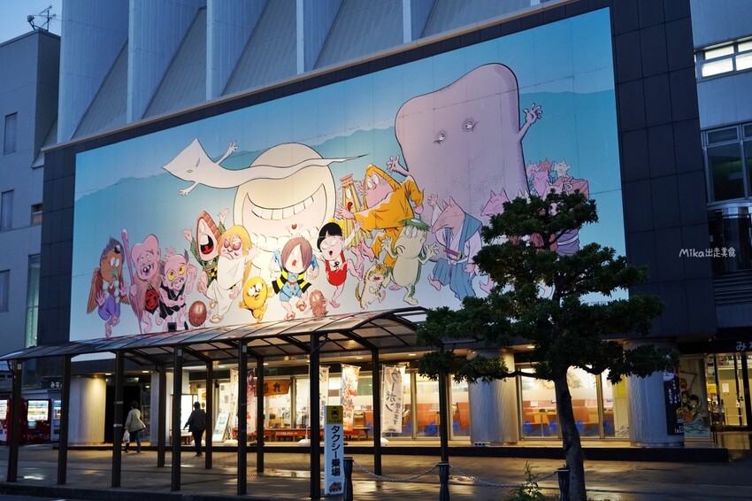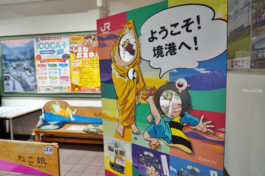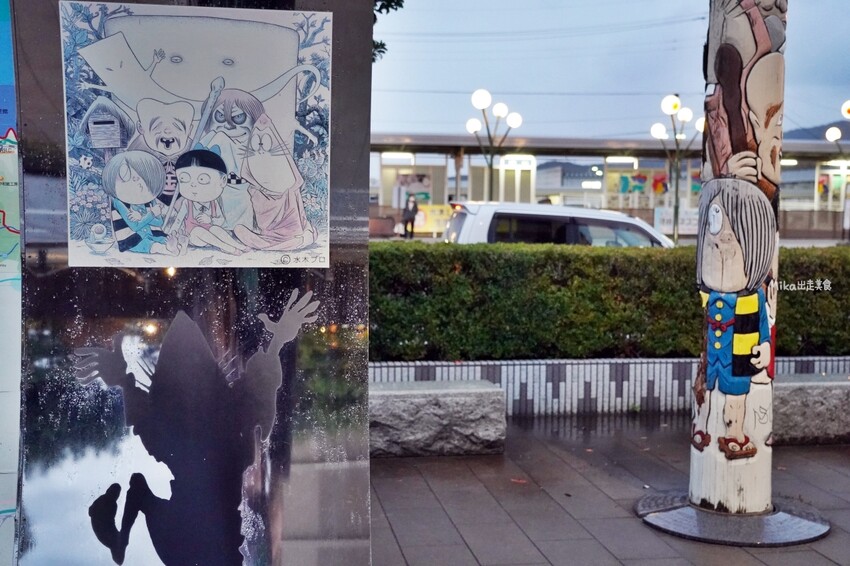 一出車站就可看到水木茂正在桌子上畫著漫畫的Q版雕像, 旁邊有鬼太郎、鼠男、眼珠老爹正在關注着情況。沒錯,境港正是《鬼太郎》漫畫作者水木茂的家鄉!!