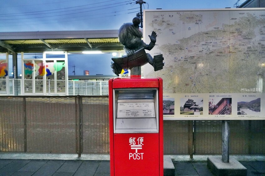 紅色的郵筒上面坐著鬼太郎,通常他是坐在一反木棉上在空中飛翔,不過這裡他坐著明信片,真有意思!!