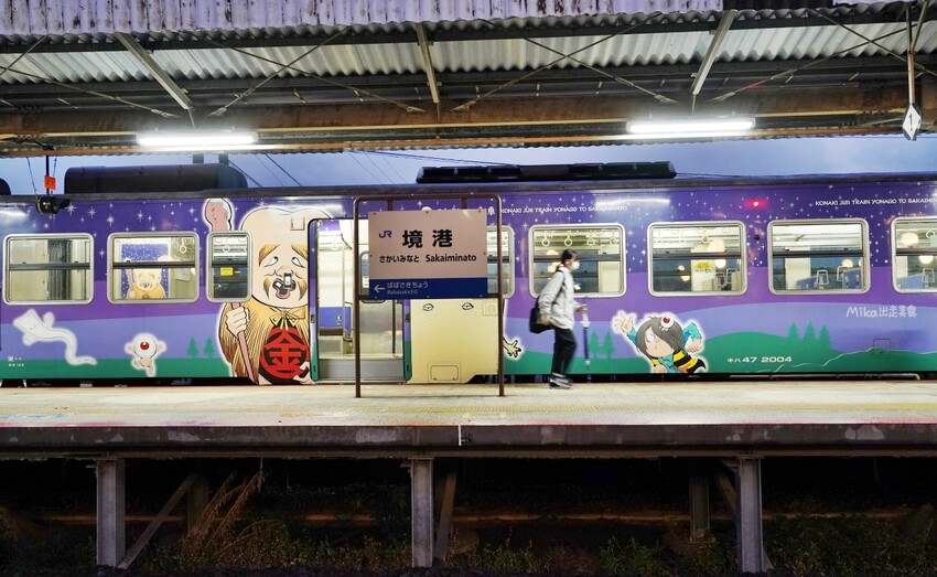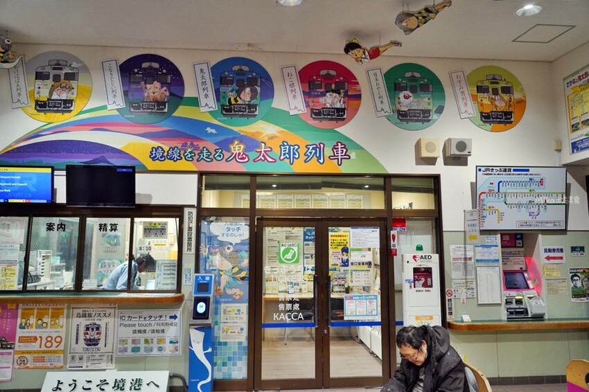 JR境線,除了2000年8月登場的“鬼太郎列車”之外,2005年11月的“新·鬼太郎列車”、2006年2月有“鼠男列車”、2006年7月有“貓娘列車”運行等等,現在有6款彩繪列車行駛中,種類仍在逐漸新增忠,可愛的鬼太郎列車,不僅在外觀上有家族角色的彩繪裝飾,車內也有各種可愛的彩繪,很受孩子們歡迎,也 讓境線的旅行變得很快樂。