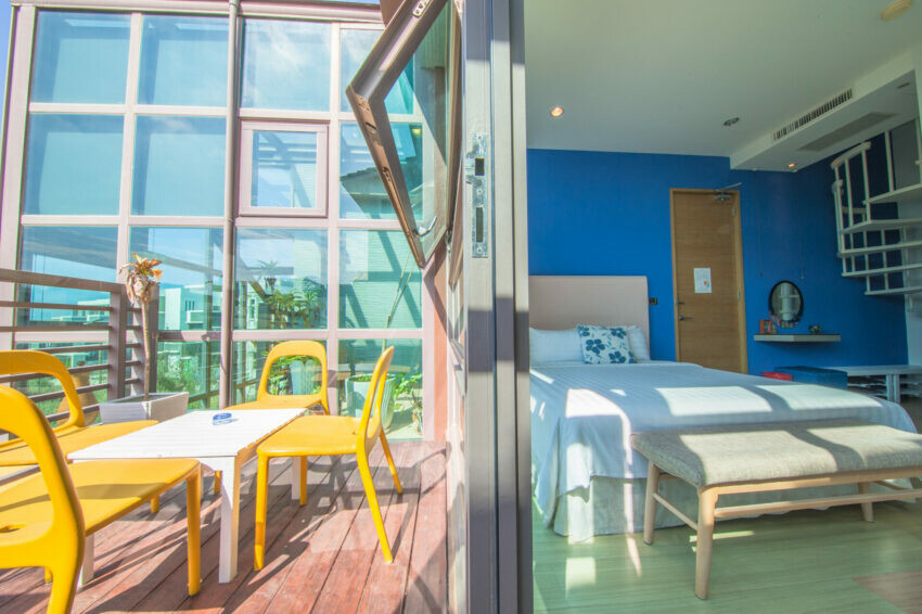澎湖有一處馬公西衛海民宿村,這裡是由數棟藍、白、紫、黃、綠等獨棟建築所組成的色彩繽紛小村落,其中這棟以黃色為基底,呈現幾何形狀的「海之徑澎湖民宿」散發淡淡普羅旺斯風格特別搶眼。建築物前方帶有自家庭院,還有一個白色搖椅點綴一到門口就令人感到放鬆。走進內部公共空間色調多彩溫暖與建築外觀相呼應,從民宿內及客房數個角落都能夠從窗戶眺望其他民宿村的建築,整體視野彷彿置身夢幻陽光小鎮。