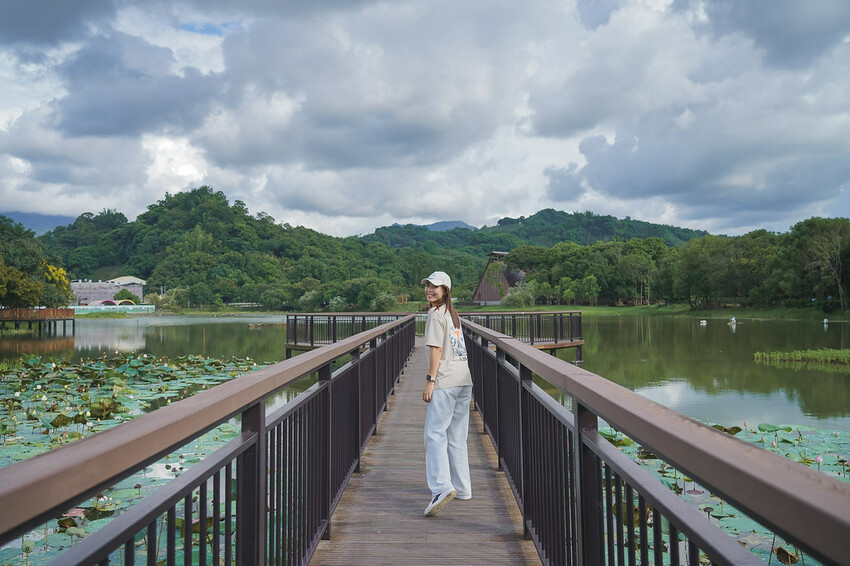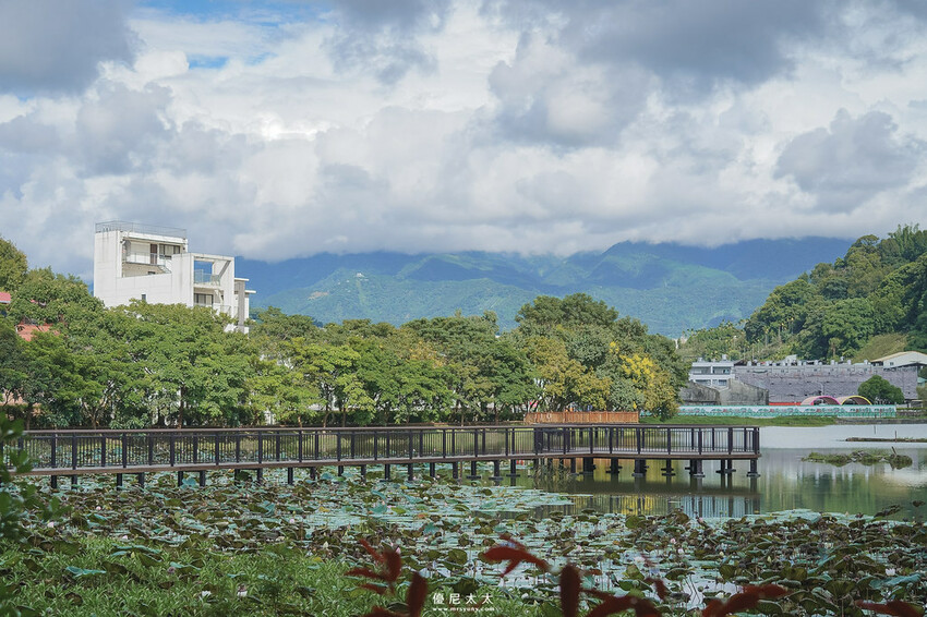 當初第一次看到這個湖面實在是太驚艷了!不僅有荷花池的點綴,背景還有遼闊的群山白雲,走在這個全長有1000公尺的步道,湖光山色的景色著實讓人留戀。而這個生態池的前身,為這個東南亞最大製材廠的『貯木池』,不過後來隨著製材廠的結束才轉型為這個生態池,但目前還是可以看到許多浮木保留在池中,聽導覽人員表示,園區正在努力還原成當初貯木池的景色給民眾欣賞,另外,園區種植的荷花池也頗為盛名,每年5~8月便會搖身一變成為台中知名賞荷花景點。