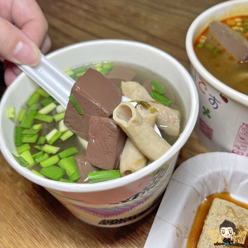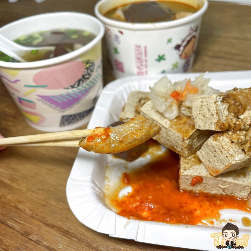 店家有三寶,除了炸得夠酥夠脆的臭豆腐+水果泡菜以外,還有料多味美的小腸豬血湯和辣香十足的麻辣鴨血臭豆腐