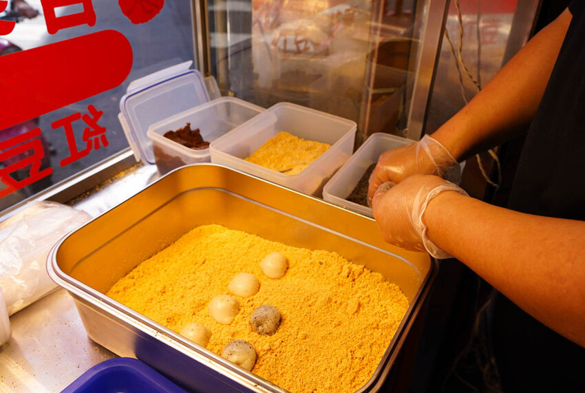 一顆顆滾上花生粉小麻糬,看起來好療癒~