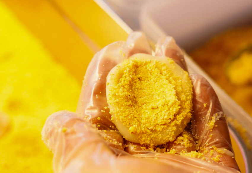 包好麻糬滾上一圈花生粉,純粹的花生粉,沒有添加其它澱粉,成本當然比較高!