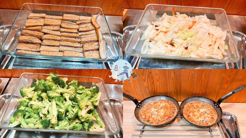 今日主食是炊飯,熱菜有烤雞、魚肉、宮保雞柳、蒸茄子、高麗菜、花椰菜、涼拌龍鬚菜、烘蛋、炸香菇、炸地瓜、溫泉蛋、鹹豬肉配蘿蔓生菜,還有熱湯山藥排骨湯~每一道的調味都非常合我們胃口!