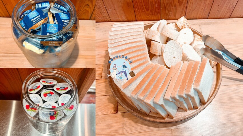 早餐提供的是白粥、吐司、培根、炒蛋、季節時蔬、肉鬆,種類算是應有盡有,讓我們一家早餐吃飽飽~