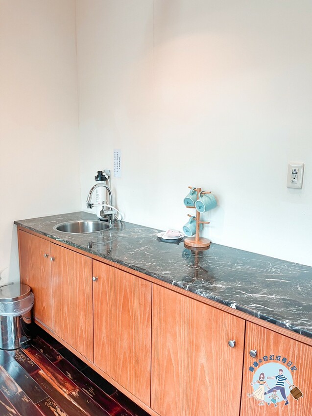 在客廳的另一個角落則有設置洗手檯、熱水壺、杯子可以使用,晚上泡一杯熱茶喝很不錯呢!