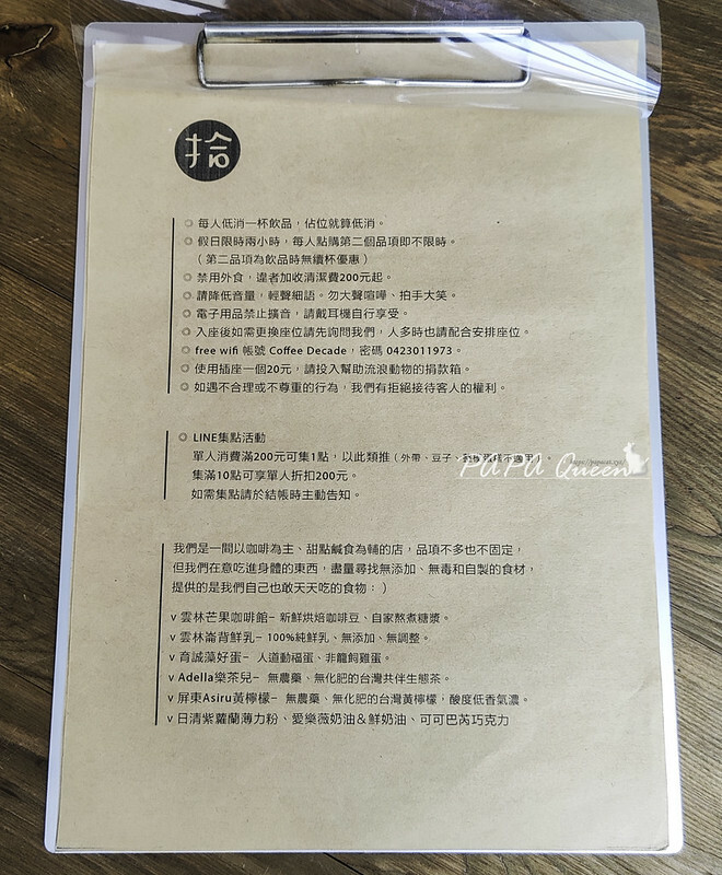 沒有明顯的招牌,印象中朋友說這裡門口有個小小燈箱寫著「拾」而這天PAPA跑來喝咖啡只看到木頭看板寫著店名,機車可停店門口,汽車一族就自行找車位囉!