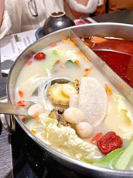我這次點了鴛鴦鍋,另外一個鍋是,黃金土雞湯底是大骨跟蔬菜多時熬製的喔!
