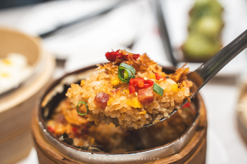 這道也好好吃,港式臘腸切丁上面在擺滿XO醬,滿滿的干貝絲香氣很足。用荷葉包裹著糯米一起蒸,讓米飯多了一層荷葉的清香。