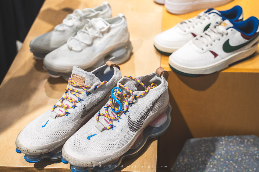 NIKE KICKS LOUNGE 推出的小編嚴選商品有海鹽白氣墊針織鞋、全白仙女針織鞋以及酒紅藍綠復古拼接鞋(特惠價2390元、大江獨家加贈300元電子現金券)