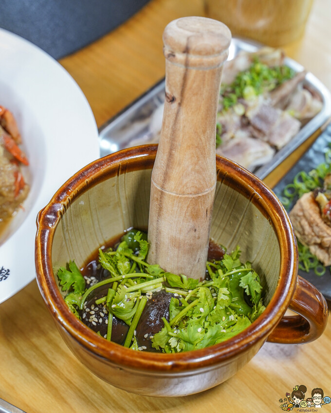吃的時候記得用木槌搗一下,讓皮蛋融合醬汁、香菜、青龍