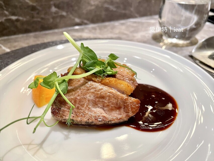 法式鴨胸苦甜巧克力橙汁醬,使用飼養75天的宜蘭櫻桃鴨,搭配58%苦甜巧克力製作而成的橙汁醬,我個人覺得醬汁的柑橘味較為明顯,巧克力好像風頭被搶過去了。鴨胸本身口感不錯,尾韻還是帶有一點點鴨味~
