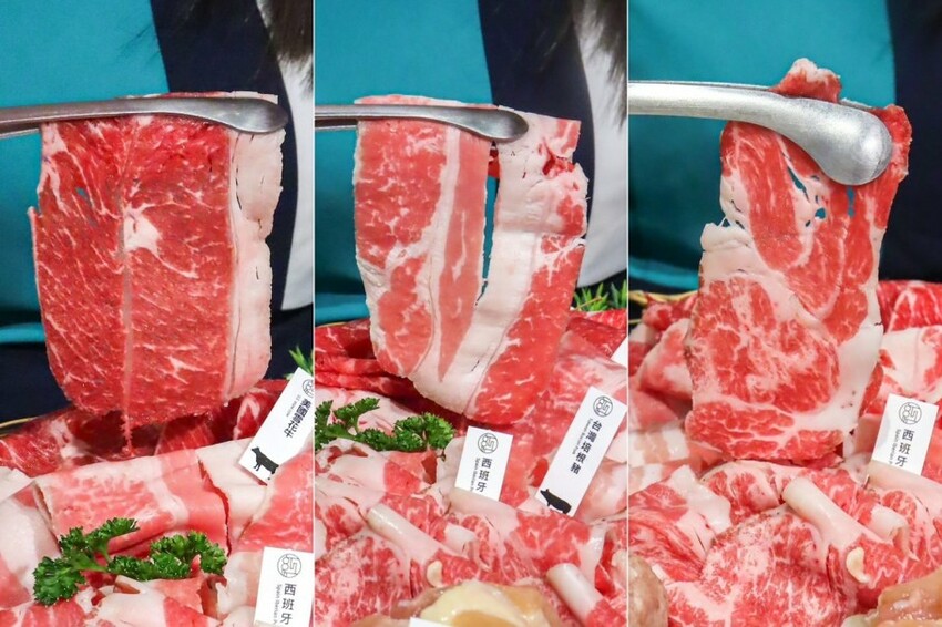 ▼由左至右是美國雪花牛、台灣培根豬、西班牙伊比利豬,肉片厚度和大小都很適中,一口塞下很過癮!看看這個油花有多漂亮~最喜歡美國雪花牛,油脂豐富,口感柔軟。伊比利豬相較培根豬更多了些口感
