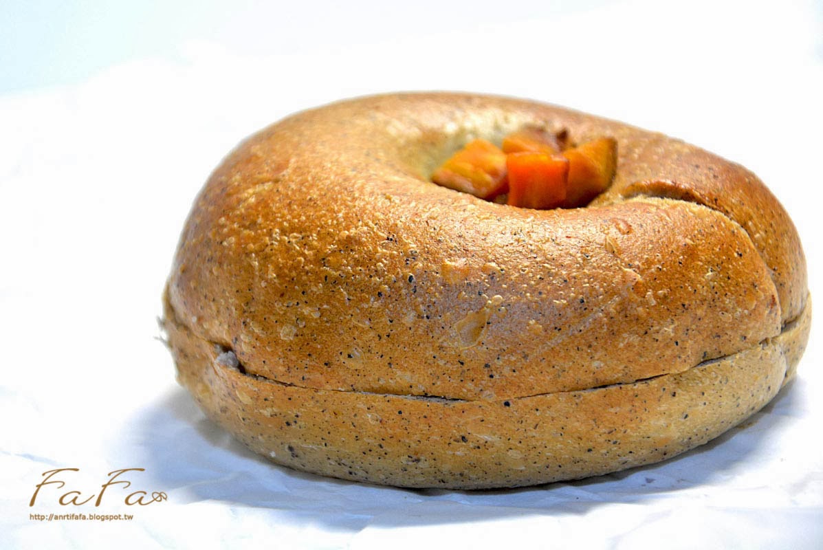 | 黑糖紅豆蜜番薯 NT$60 上方是自製番薯丁,甜甜的有點硬度, 內陷是臉色些許蒼白的萬丹紅豆,排列整齊的圍繞在貝果溝裡, 不是一般的紅豆泥,而是飽滿富有甜度的顆粒紅豆。 而且Bagel的紅豆香味很明顯。 |