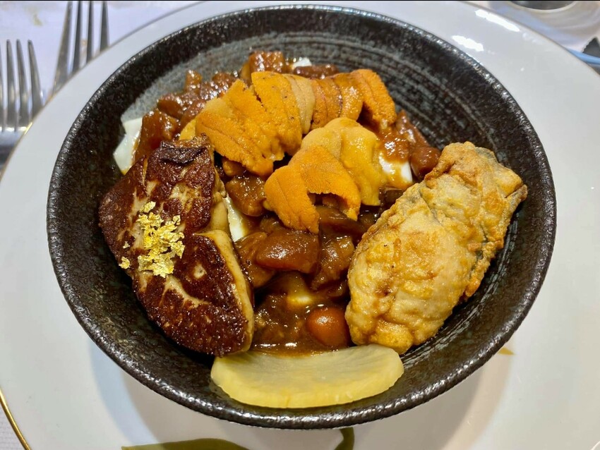 早期吃到的是鴨肝佐馬鈴薯泥,最後一直進化到台北市最奢華的滷肉飯,就是以金箔點綴,搭配肥美鴨肝、炸得香酥的蚵仔,還有黏嘴噴香的肉燥,再攪入半熟蛋黃形成的鴨肝蚵仔酥肉燥飯,令所有饕客為之瘋狂。