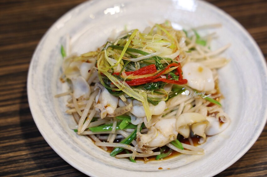 這道是薄切的鮑魚,以豆芽韭菜襯底,其上搭以蔥絲。