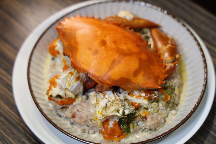 肥美的沙母,滿滿的蟹黃豔紅了整道餐盤。其下的蒸肉餅,加入了皮蛋,增加口感及香氣。