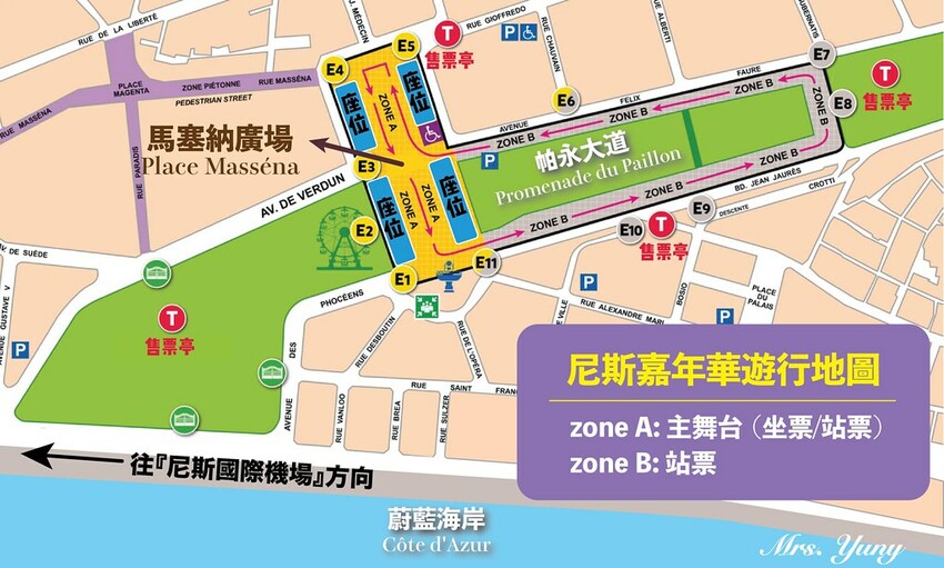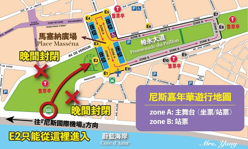 ▲ 尼斯嘉年華遊行(活動)地圖,E1~E11為入口區
