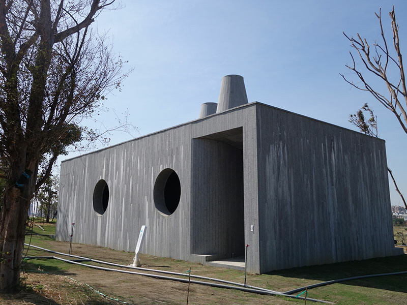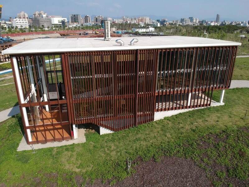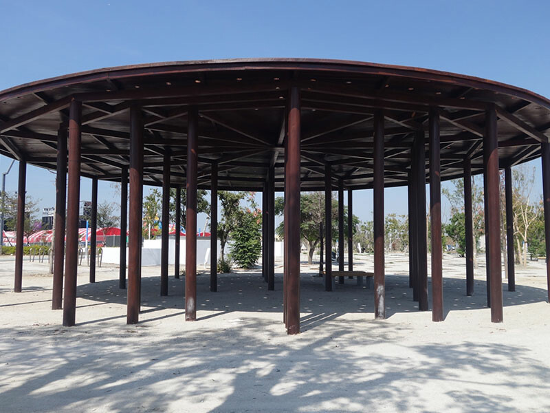 公園一處半開放的空間,遠看好似一座外星船,或是一顆超大的OREO餅乾,以漸層式的屋頂開孔,透過不同密度的屋頂透光設計,搭配日照灑落多種不同的進光量,在相同的空間,因為日光進入的多寡而感受溫度的不同。