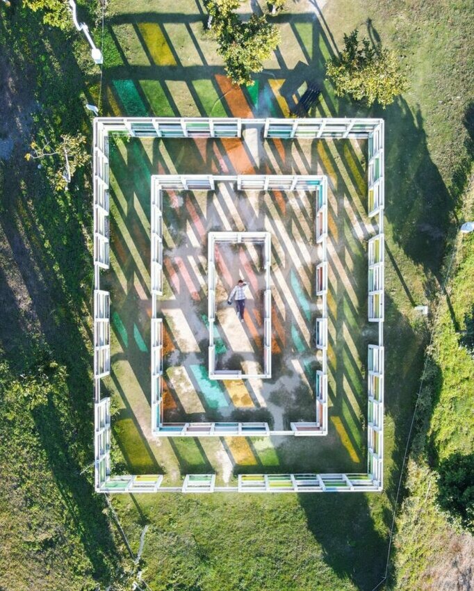 白色的屋瓦、多彩的玻璃圍繞,使用藍色、黃色及透明玻璃所包圍而成的空間,裡面不同顏色形成了三個獨立的空間,卻共同由一個屋頂覆蓋所組成。這三個不同的顏色,創造出不同的氛圍以及時間感受,遊客可在此體驗不同的光線變化,想像時間與生活的空間感受。