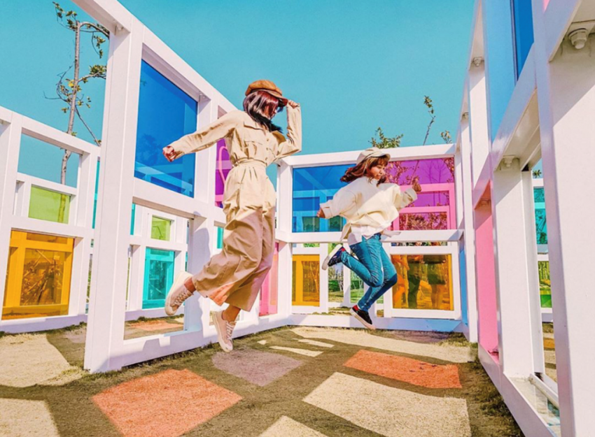 視覺體驗區的「水湳普普風濾色地景裝置藝術」是中央公園夯的網美打卡景點之一,一整片的公園綠地中,藏著一座迷幻的玻璃迷宮。迷宮整體由方塊組成,運用普普風的思維,在窗格上鑲入各種繽紛顏色的透明玻璃,陽光將彩色玻璃烙印在草皮上,形成大方活潑的光影藝術,民眾可透過特定波長光線,體驗周遭環境變化,大方活潑的光影藝術,遊客能從窗框、門框中間找尋最適合的拍照打卡點!