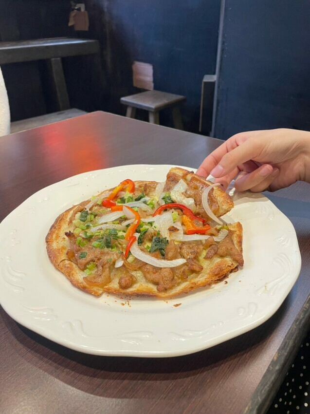 妖怪村除了各式奇特又美味的甜食外,也推薦大家來避煞專家吃鹹食,小編點的是「山豬肉披薩」,中西合併的創新口味,餅皮為薄皮的,酥脆的口感加上淡淡的焦香味,配上肥而不膩又有嚼勁的山豬肉,非常推薦大家來品嘗看看。除了中西合併的創新口味外,也可嚐嚐看「台式披薩」,以蔥抓餅作為餅皮,配上滿滿餡料,推薦大家來品味一下。