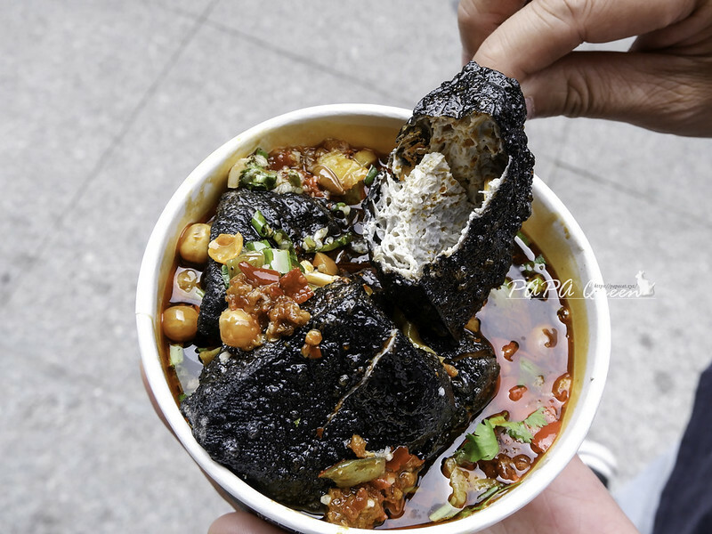 就站在路邊吃,臭豆腐上面幾塊都是這樣蓬鬆一咬爆汁挺過癮的!底下幾塊臭豆腐則變成炸乾縮水款!大貓吃到最後幾個推給我說 ,太硬了交給你!
