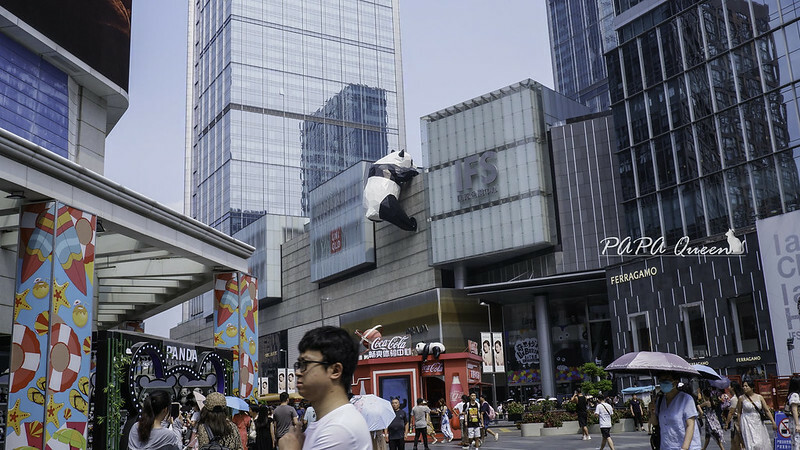 成都IFS国际金融中心,就會看到外牆上巨大的熊猫雕塑巴著大樓,整隻熊貓身体棱角分明(幾何概念),前爪抓着屋顶,後腳撑在牆上,半個身子已經爬上了屋頂,留下碩大的屁股對着下面的人群