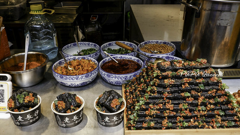 成都小攤上販售長沙黑色臭豆腐,點了一份! 老闆快手加入各種醬料,辣椒粉,辣油,香菜,炸黃豆(這裡不愛放花生),是這樣一份帶湯的黑色臭豆腐!
