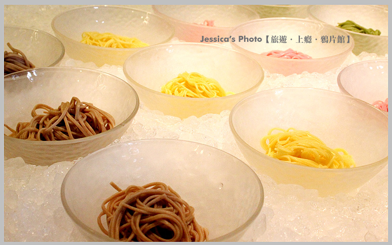 為了保鮮,不同顏色的麵條,底下當是碎冰。