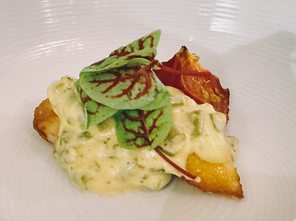 中間上了一杯果汁迎接最後一道主菜,長尾鳥魚搭配塔塔醬和紅酸模.