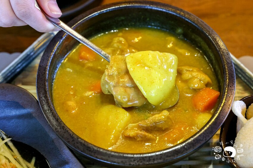 以薑黃提升咖哩風味,咖哩醬口味溫和,馬鈴薯和紅蘿蔔軟綿入味,雞肉就比較普通,最推的食用方式就是把咖哩醬搭配招牌薑黃飯,又香又好吃。