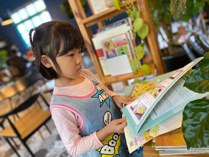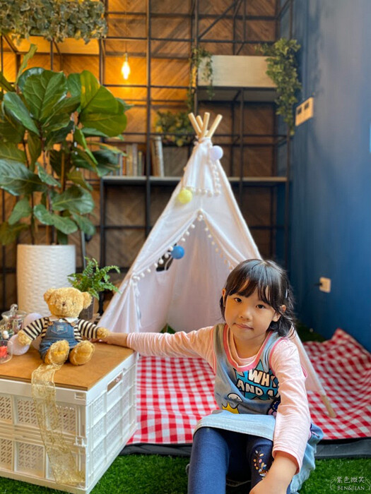 不管是天花板星光點點的燈飾、後方的鐵架植栽書牆或是地板的黑白花磚,真的好美。