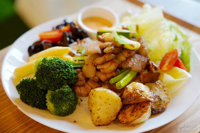 一旁的配菜有花椰菜 馬鈴薯 玉米筍 高麗菜 黑木耳~~滿豐富的,整体搭配真的是秀色可餐!!