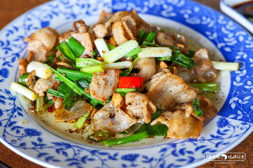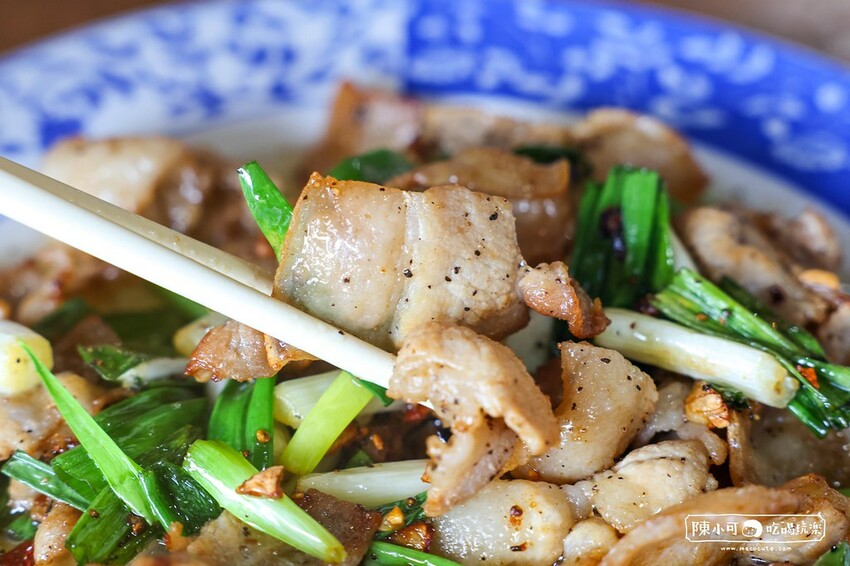 加上蔥段、胡椒和辣椒拌炒,相當下飯的一道菜,皮Q彈牙,肥嫩好吃。