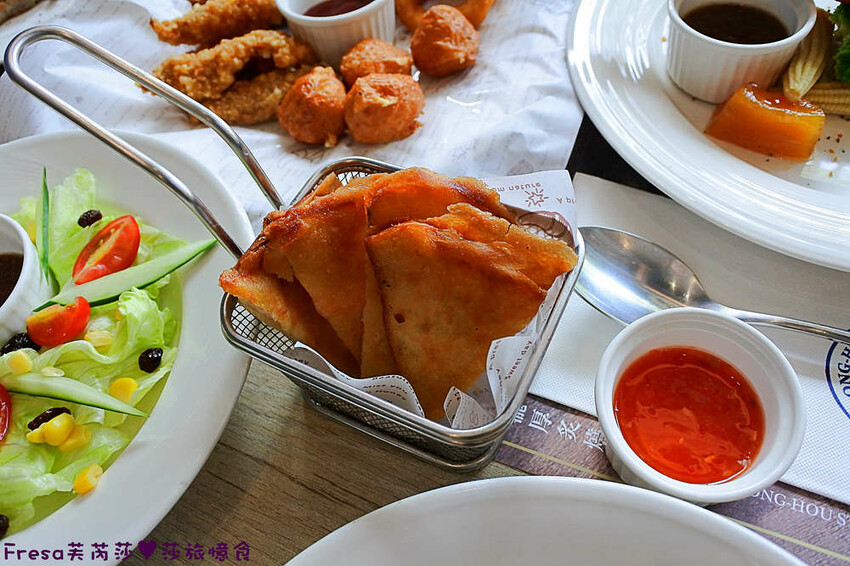 可愛的鐵籃裝著泰式蝦餅,貼心的切片擺盤~