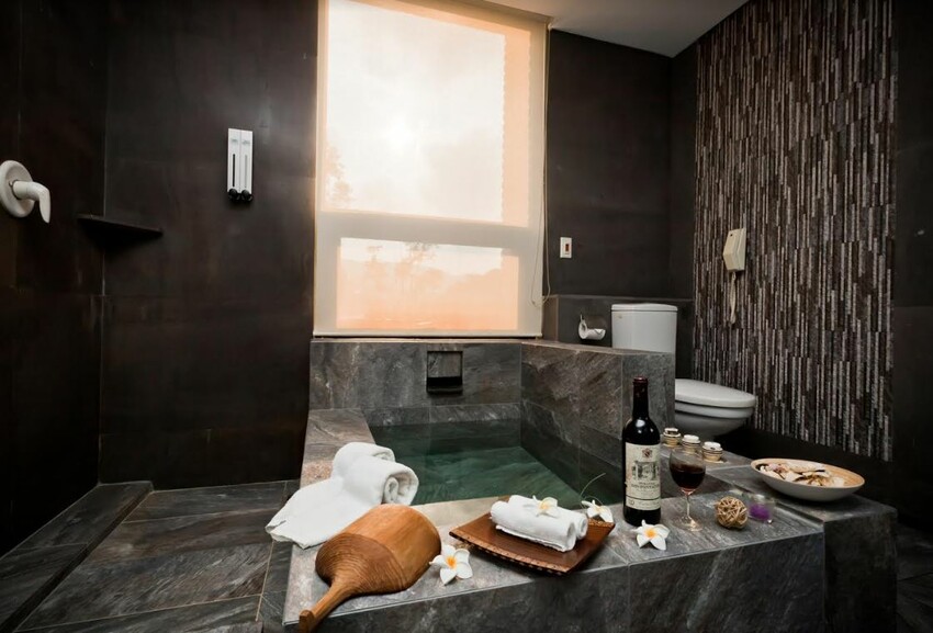 室外的露天溫泉池,夜晚打燈後,顯得格外有情調,提供了各種精油池,如玫瑰、薰以草,薄荷精油等,在這裡住上一晚,工作的辛勞瞬間減輕了不少。