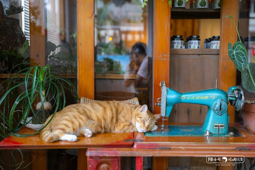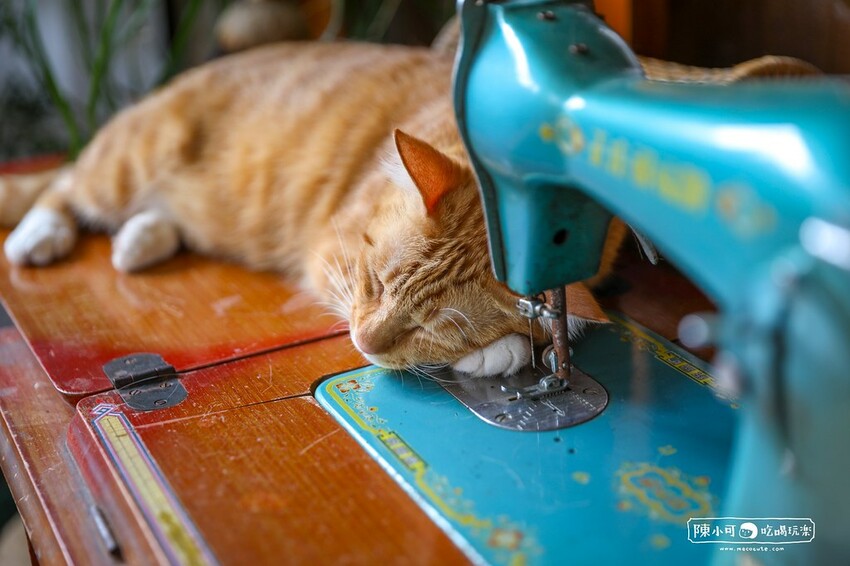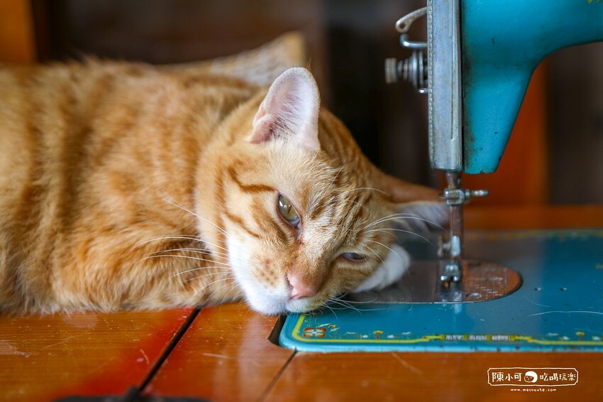 橘貓慵懶地睡在裁縫機旁邊,時不時張開眼看一下來訪的客人。