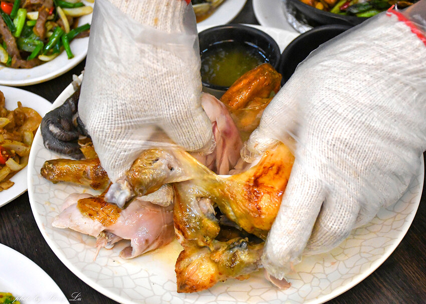 吃烤雞就是要豪邁的徒手剝雞阿!(店家有附上手套、所以不用怕燙)看著剝雞的過程中,一直有雞汁流出來,大家都忍不住「哇」一聲讚嘆,這實在太誘人了啦